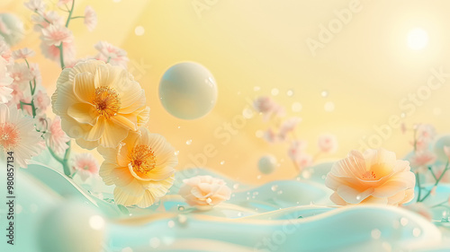 Obraz premium Soft pastels dance in a dreamlike landscape of blossoms and floating orbs at...