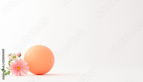 Fototapeta premium Soft peach sphere beside delicate pink flowers on a clean white background,...