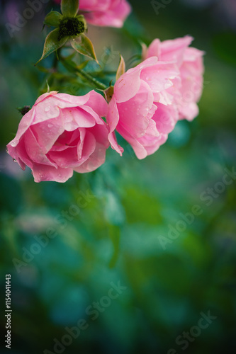 © darkbird, Fototapeta premium Soft petals of pink roses with drops of rain offer a serene and elegant floral display