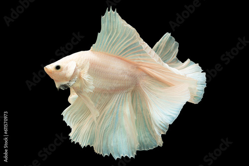 Obraz premium Soft pink accents beautifully complement the pristine white color of the betta fish creating a harmonious and visually appealing contrast, Multi color fish.