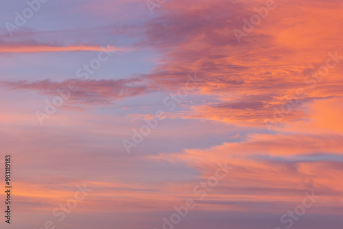 Fototapeta premium Soft pink and orange clouds blend gracefully in the evening sky, creating a dreamy atmosphere. Sunset colors mix with blue, purple, red, and yellow hues, painting a vibrant scene