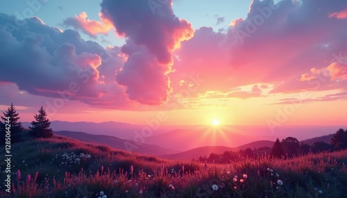 © suchetpong, Fototapeta premium Soft pink and peach tones fade into blue as sun dips below horizon, landscape, natural light