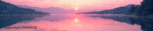 © AiGallery, Fototapeta premium Soft pink and peach tones on tranquil lake at dusk, reflection, lake, water