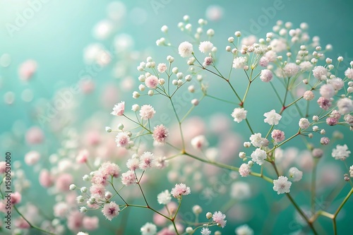 Fototapeta premium Soft Pink and White Baby's Breath Flowers, Delicate Spring Floral Background, Romantic Pastel Teal.