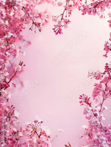 Fototapeta premium Soft pink background with central blank space, edged by gently curving branches cherry blossoms
