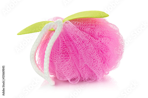 Obraz premium Soft pink bath puff or scrub with two green leaves, reflected on the surface, personal hygiene product isolated on white background
