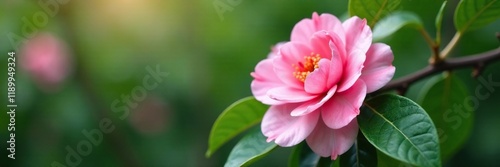 © Hugnaka, Fototapeta premium Soft pink camellia flower with glossy leaves on a tree branch, nature, camellias