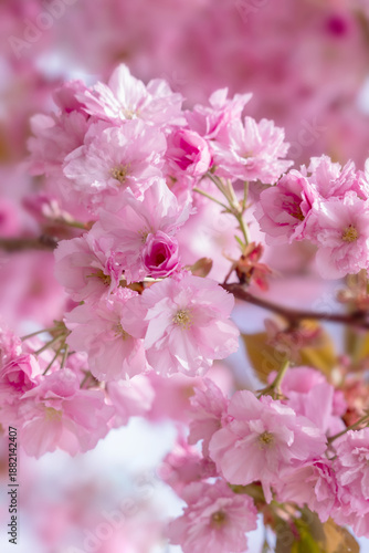 Obraz premium Soft Pink Cherry Blossom Blooms on Slender Branches in a Spring Garden Scene With Sunlight