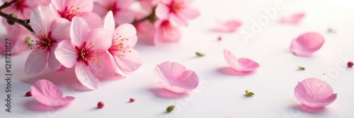Fototapeta premium Soft pink cherry blossom petals scattered on a white surface with a few leaves, flowers, soft, nature