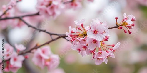 Obraz premium Soft pink cherry blossoms against a gentle springtime blur background, flowers, nature