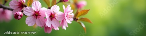 Fototapeta premium Soft pink cherry blossoms on branch against blurred green background, petal,...