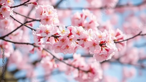 Obraz premium Soft pink cherry blossoms sway gently on delicate branches in a serene atmosphere, bloom, nature, calm