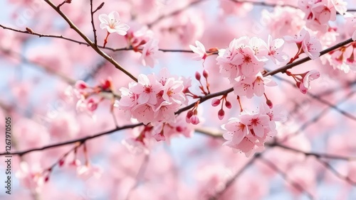 Obraz premium Soft pink cherry blossoms sway gently on delicate branches in a serene atmosphere, serene, flower