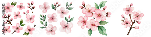 © Totomonk, Naklejka premium Soft pink cherry blossoms with delicate leaves create serene atmosphere, isolated on transparent background.