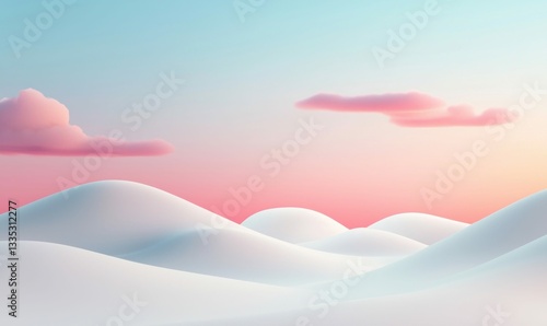 Obraz premium Soft pink clouds drift over serene, rolling white hills at sunset, a dreamy...