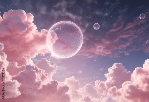 Obraz premium Soft pink clouds with floating bubbles in celestial sky, romantic, beauty