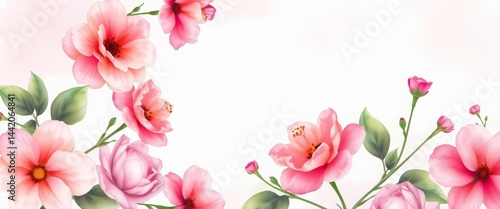 © Bamphen, Fototapeta premium Soft pink floral watercolor frame background with delicate brushstrokes, roses, border