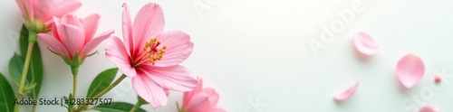 Fototapeta premium Soft pink flower petals against a white and green leafy background, floral,...