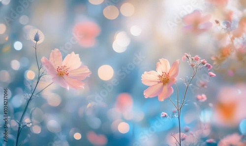 © jambulart, Fototapeta premium Soft pink flowers, blurred blue background.