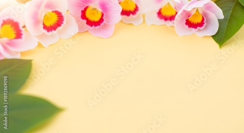 © Afsana, Obraz premium Soft pink flowers on yellow background with green leaves