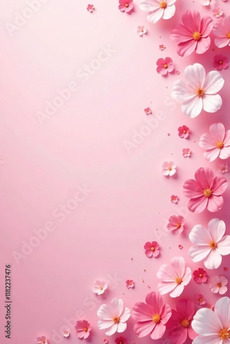 Fototapeta premium Soft pink gradient background with scattered flowers, pastel, soft