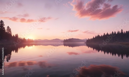 Fototapeta premium Soft pink hue of sunrise over calm lake surface, reflections, golden light