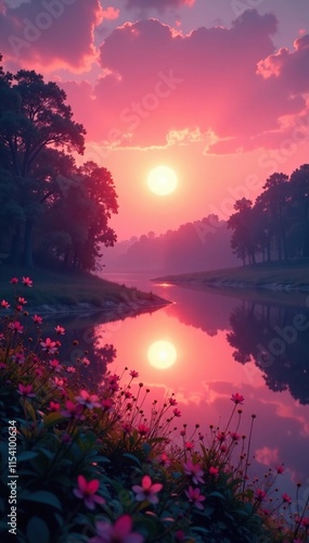 © Janmo, Obraz premium Soft pink hues across the twilight sky with a reflected sun, nature, serene atmosphere, soft focus