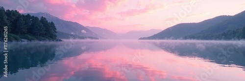 © Withun, Fototapeta premium Soft pink hues dissolve into serene lake waters, water, peaceful, reflection