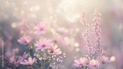 © Bijac, Naklejka premium soft pink light creating a dreamy abstract background, with delicate flower bokeh effects that evoke a sense of calm and vintage charm in a pastel palette