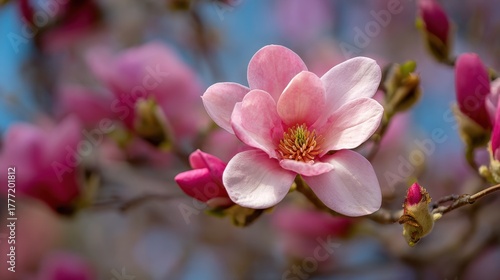 © Formoney, Obraz premium Soft pink magnolia flowers bloom gracefully on branches under the sun in springtime beauty.