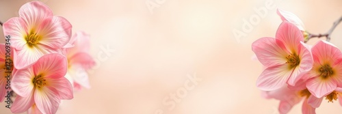 Fototapeta premium Soft Pink Peach Flower Petals Frame Blurry Light Background, peach blossoms,...