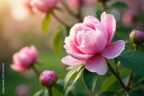 Fototapeta premium Soft pink peony blossoms unfold on the tree's branches, bloom, spring blooms,...