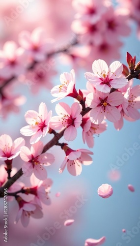 Obraz premium Soft pink petals falling from a blooming cherry blossom tree in early spring, blossoms, pastel