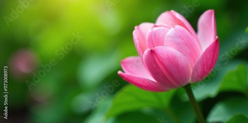 © Prasert, Obraz premium Soft pink petals unfolding against a lush green foliage, horticulture, spring