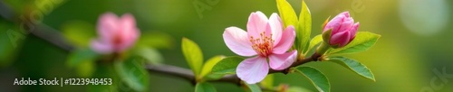 Fototapeta premium Soft pink petals unfurl on a branch amidst lush green leaves, blossom,...