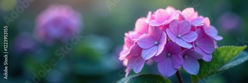 © anu, Fototapeta premium Soft pink purple petals of hydrangea bloom in morning dew, blue undertones, serene garden, morning dew