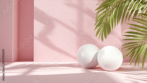 © feri, Fototapeta premium Soft pink room with palm leaves and spheres