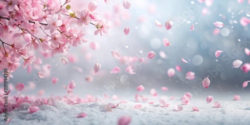 © Nasnunt, Fototapeta premium Soft pink sakura petals falling gently on a snowy white background, creating a serene and peaceful atmosphere, blossoms
