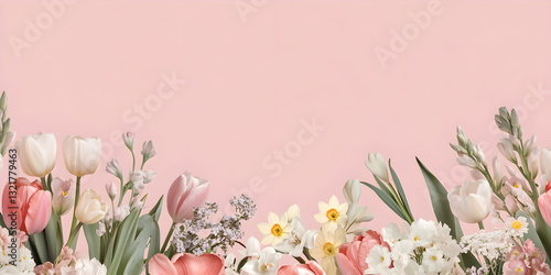 © LenaPolia, Naklejka premium soft pink tulips on peach pink background. trendy, concept women's day, march, 8th . Wallpaper background. , top view, copy space, spring, summer, macro