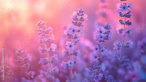 Naklejka premium Soft purple flowers bloom under a warm light during sunset in an open garden