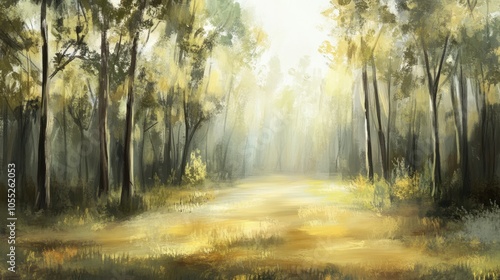 Naklejka premium Soft rays of sunlight filter through the tall trees, casting light on the...