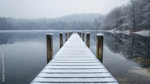 Fototapeta premium Soft snow blankets a wooden dock extending into a tranquil lake. Surrounding...