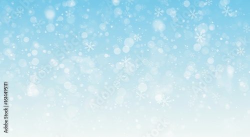 Fototapeta premium Soft snowfall and bokeh lights on a light blue background.