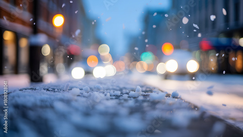 © Asif Rubayet, Obraz premium Soft snowfall on a city street with blurry lights