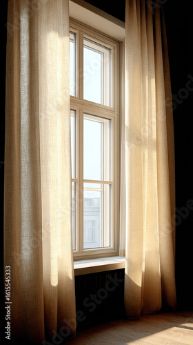 Fototapeta premium Soft sunlight filters through beige curtains on bright window