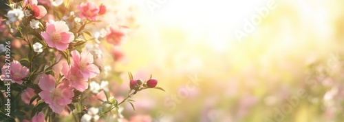 © BerkahStock, Fototapeta premium Soft sunlight illuminates delicate pink flowers in a blurred garden background.