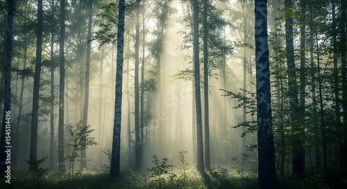 © Jaheda, Obraz premium Soft Sunlight in a Misty Tall Tree Forest