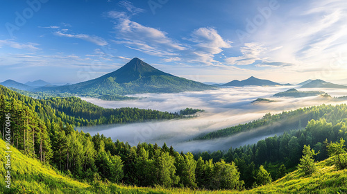 Naklejka premium Soft sunlight on misty mountain landscape, tranquil and serene