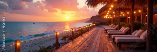 Obraz premium Soft sunset light blends with warm yellow string lights on beach resort's...
