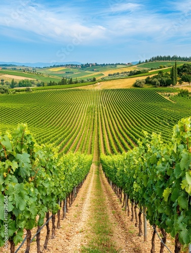 Fototapeta premium Soft travel concept. Lush green vineyards stretching towards rolling hills under a blue sky.